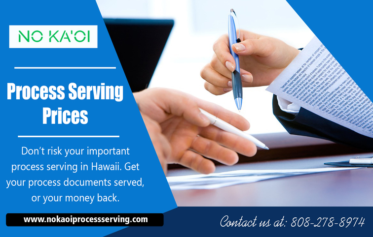 Process Serving Prices can be affected by many factors AT https://www.nokaoiprocessserving.com/pricing/ Find Us On Google Map : https://goo.gl/maps/nbGEGGwGdy82 The laws and regulations for process servers are continually changing, and it can be a challenge to keep up with those imposed both nationally and in individual states. However, it is imperative for them to find a way to stay in the know. Those who fail to keep up with changing regulations could find themselves embarrassed in the best-case scenario, and losing business or even unwittingly committing a crime in the worst-case scenario. Social : https://plus.google.com/u/0/107780255044229735642 https://www.youtube.com/channel/UCv9z3QigoeBuxijhlJXCD1A https://twitter.com/HawaiiServer Street Address: 2585 ALA NAMAHANA PKWY,